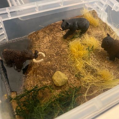 This diorama was made by an aspiring paleontologist. This young, talented person made this scene of a woolly mammoth in serious trouble! This scene happened literally thousands of times in places like the La Brea Tar Pits in California. An animal would get stuck, then predators, like bears, would go in for the kill and they would get stuck, too!