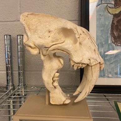 A real skull can cost thousands of dollars, so I have to get creative! This is a 3D printed model of a saber-toothed cat (Smilodon) skull. I gave it to my school's art teacher, who painted it to look like a real skull. Isn't it cool?1? The lower jaw of a real saber-tooth would hinge wide open and those canine teeth would sink into the flesh of its prey and it would be trapped! Many skulls like this have been found at the La Brea Tar Pits in Los Angeles, CA.